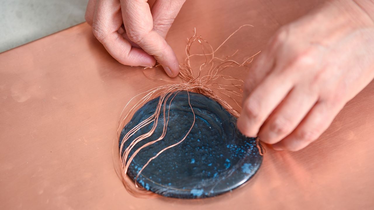 Em seu aconchegante ateliê, que ocupa um dos cômodos de seu apartamento, Claudia trabalha sem cumprir um horário fixo, uma vez que se adapta à sua agenda como professora na Escola Meninos e Meninas do Parque. Para compor suas delicadas peças, a artista coleciona pequenos objetos de vidro, fios de metal e distintos corantes. E da junção desses materiais, ela elabora seus quadros.