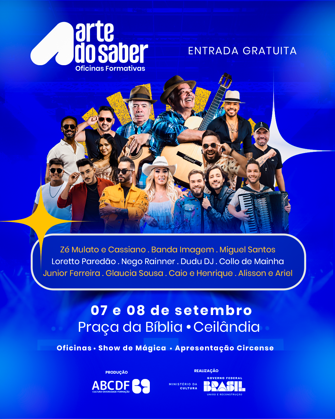 Nos dias 07 e 08 de setembro de 2024, a Praça da Bíblia em Ceilândia será palco de uma celebração da cultura popular com o evento “Arte do Saber”. Voltado para a formação artística e o fortalecimento da cultura no Distrito Federal, o evento promete promover uma troca rica de conhecimento e experiências, com oficinas, apresentações artísticas e muita inclusão. Tudo isso, de forma gratuita e acessível a toda a comunidade. Com oficinas com número limite de participantes, os interessados devem se inscrever com antecedência através do link: Formulário de Inscrição. (INSERIR LINK).