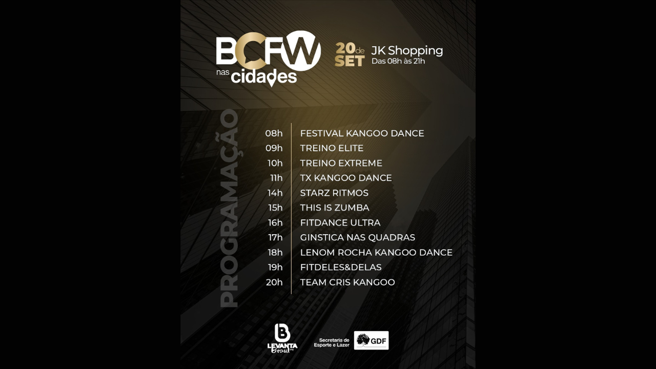 No próximo dia 20 de setembro acontecerá o BCFW nas Cidades, um encontro voltado para saúde, lazer e qualidade de vida. O evento acontece das 8h às 21h, no JK Shopping, com uma programação intensa de atividades gratuitas que prometem movimentar o público durante todo o dia.