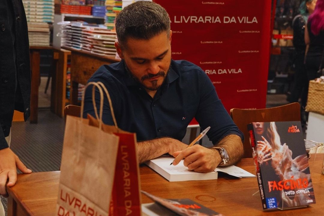 Legenda: David Correia autografa exemplares de “Fascínio” durante o lançamento da segunda edição da obra, na Livraria da Vila, em São Paulo, celebrando o sucesso do thriller psicológico que agora concorre ao Prêmio Oceanos 2025.