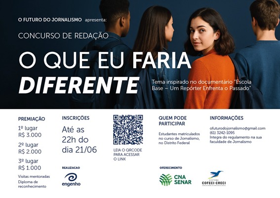 O regulamento e o QR Code de acesso às inscrições estão disponíveis na coordenação de Jornalismo das faculdades UnB, Uniceub, IES e Universidade Católica de Brasília. E também na Engenho Comunicação (61) 3242.1095.