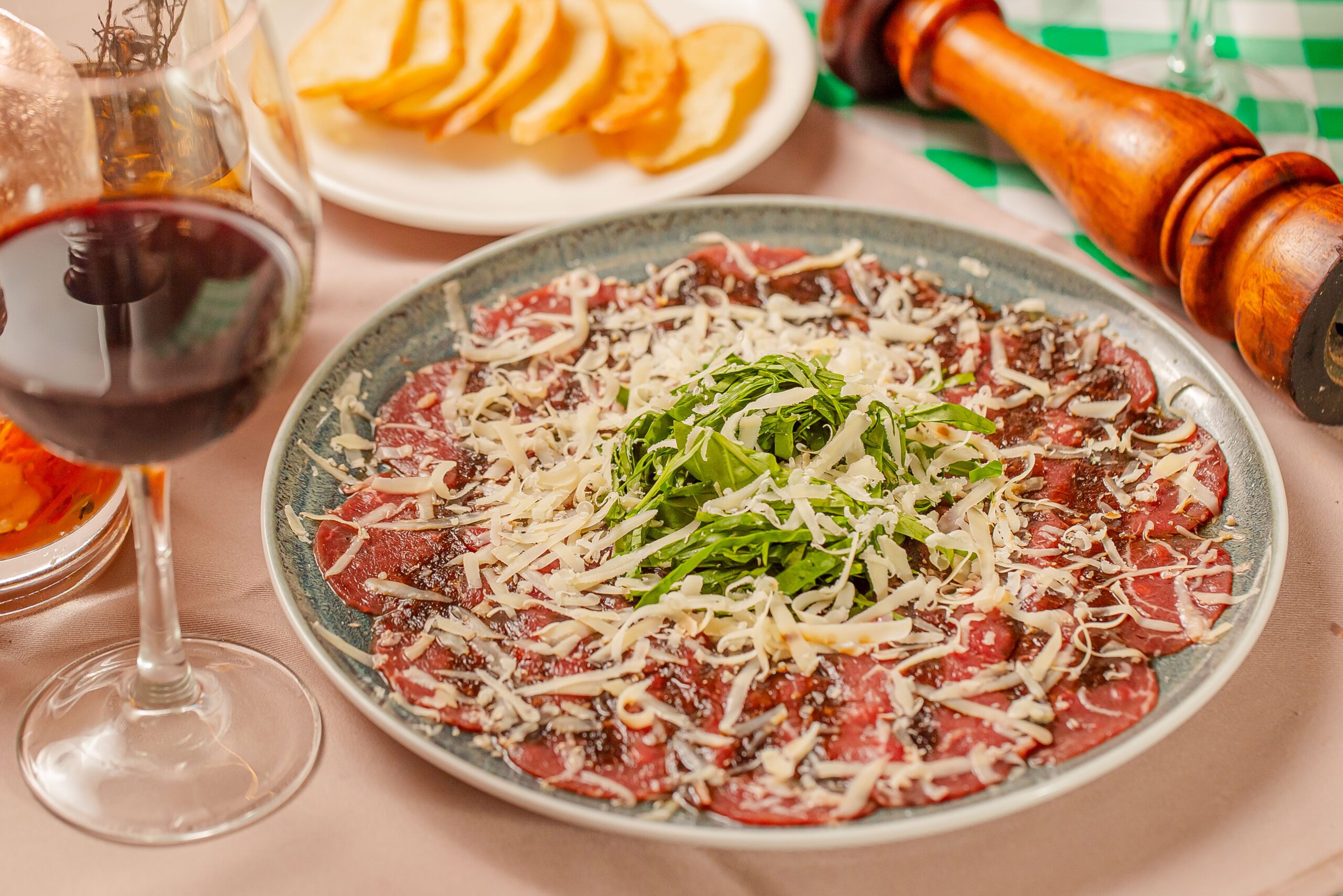 Carpaccio de Filé: finas fatias de filé mignon cobertas com redução de aceto balsâmico, azeite, lâminas de parmesão e rúcula (R$ 78, entradinha para compartilhar entre 2 a 3 pessoas);