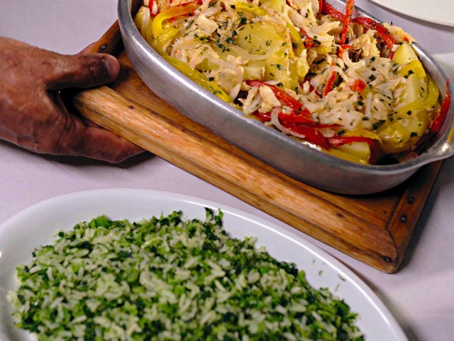Bacalhau à toda moda – Bacalhau em lascas, levado ao forno sob cama de maçãs e temperos da casa, coberto com musseline de mandioca e parmesão para gratinar.