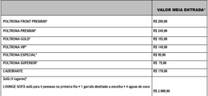 *Meia-entrada: estudantes, idosos acima de 60 anos, Pcd, professores da rede pública e funcionários públicos