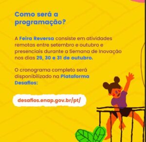 Serão selecionadas a participar da Feira Reversa 5 equipes, que participarão de 3 oficinas de capacitação e 5 sessões de mentorias online, além da apresentação de pitches individuais presenciais em Brasília, com transmissão online, para apresentação do desafio público durante a Semana de Inovação 2024.