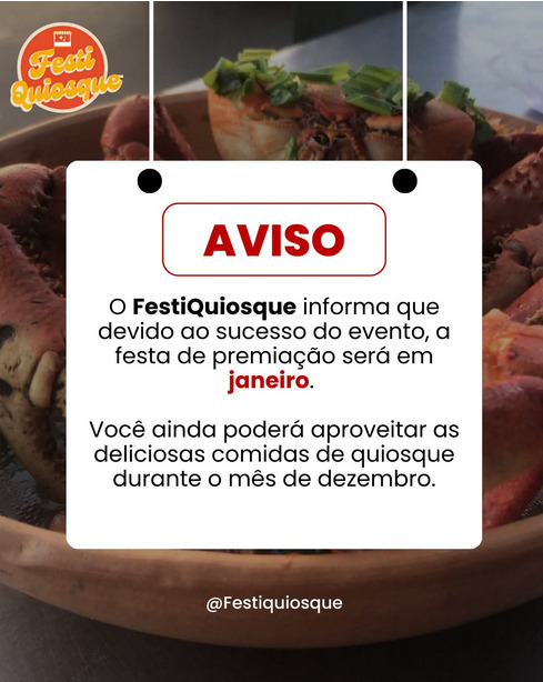 Devido ao sucesso da promoção dos cardápios dos quiosques do Núcleo Bandeirante, por meio do FestiQuiosque – Festival dos Quiosques do Núcleo Bandeirante, o evento foi prorrogado até o fim do mês. O resultado do concurso será divulgado em janeiro.