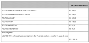Os ingressos estão disponíveis no site da Bilheteria Digital, com valores a partir de R$ 59,25 para clientes de cartões BB Visa, que podem parcelar em até seis vezes sem juros.