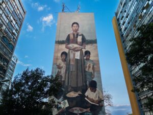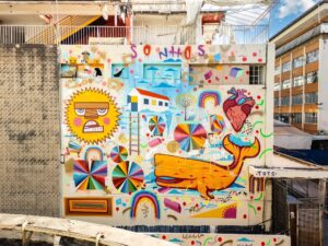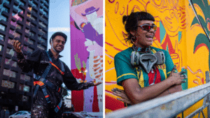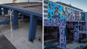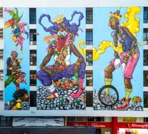 Outros nomes também emocionaram o público. Toys Daniel, em conexão afetiva com sua cidade natal, trouxe personagens lúdicos inspirados em sua “Toysland”. Rafael Sliks transformou um edifício icônico do Conic, com sua caligrafia abstrata, evocando ritmo e respiração urbana. Zéh Palito homenageou a importância do lazer e da prosperidade negra em um mural repleto de vitalidade. E JuMu apresentou fusão entre padrões, cores e técnicas, criando um mundo próprio baseado na sua herança latino-americana.