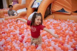 Para completar a aventura, um mergulho no mar de bolinhas laranja e transparentes. São milhares de bolinhas que transformam o espaço em um universo vibrante, perfeito para brincar, se esconder e se divertir sem limites.