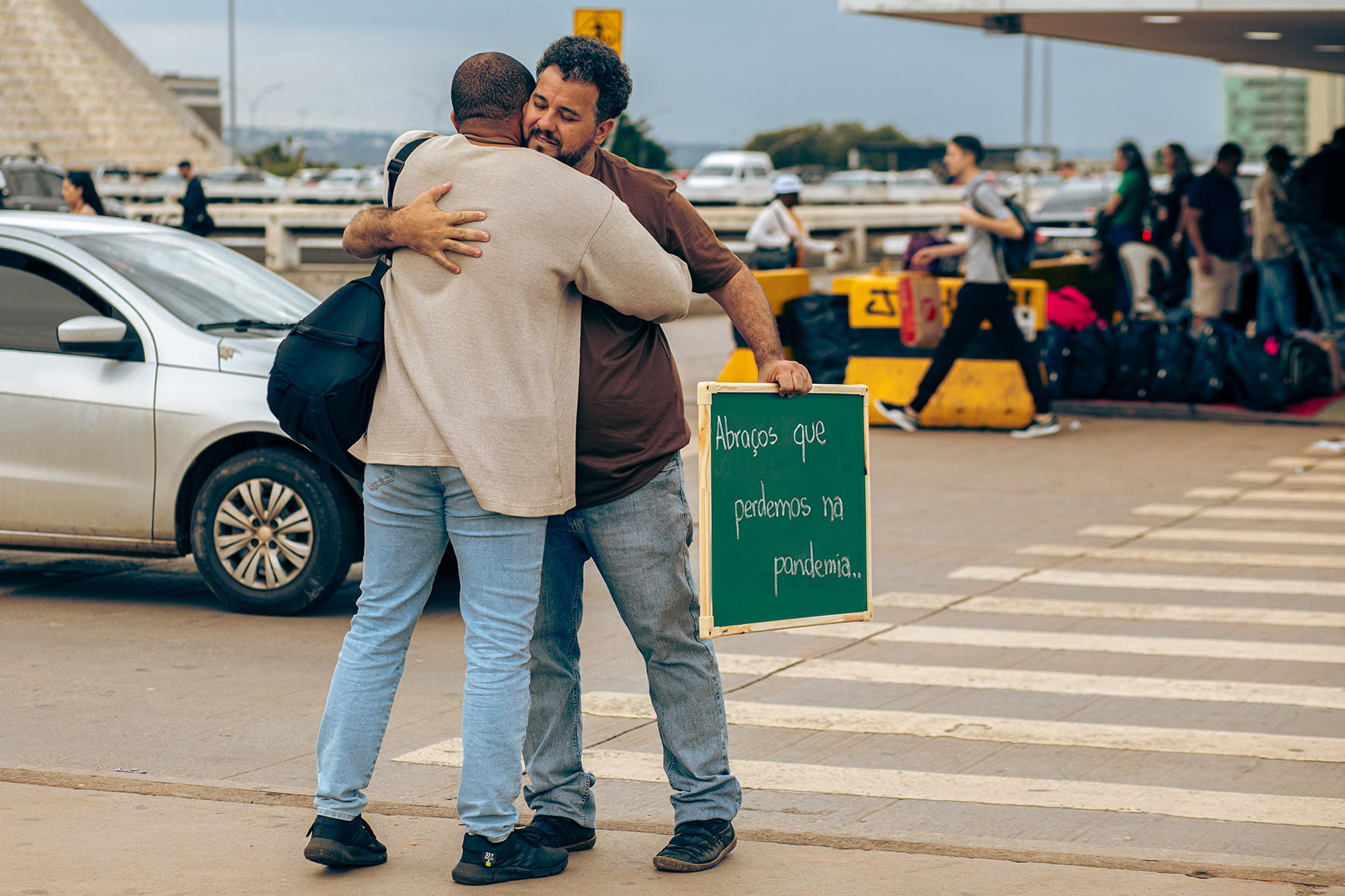 Como forma de resgatar esse afeto, o performer Robson Castro empresta sua presença para que ele e as pessoas encontrem conforto por meio de um abraço. Com uma placa onde se lê Abraços que Perdemos na Pandemia, “coloco-me como catalisador de histórias, propondo uma troca, silenciosa ou não, com as pessoas que buscam relembrar ou ressignificar o que viveram ou deixaram de viver”, comenta Castro.
