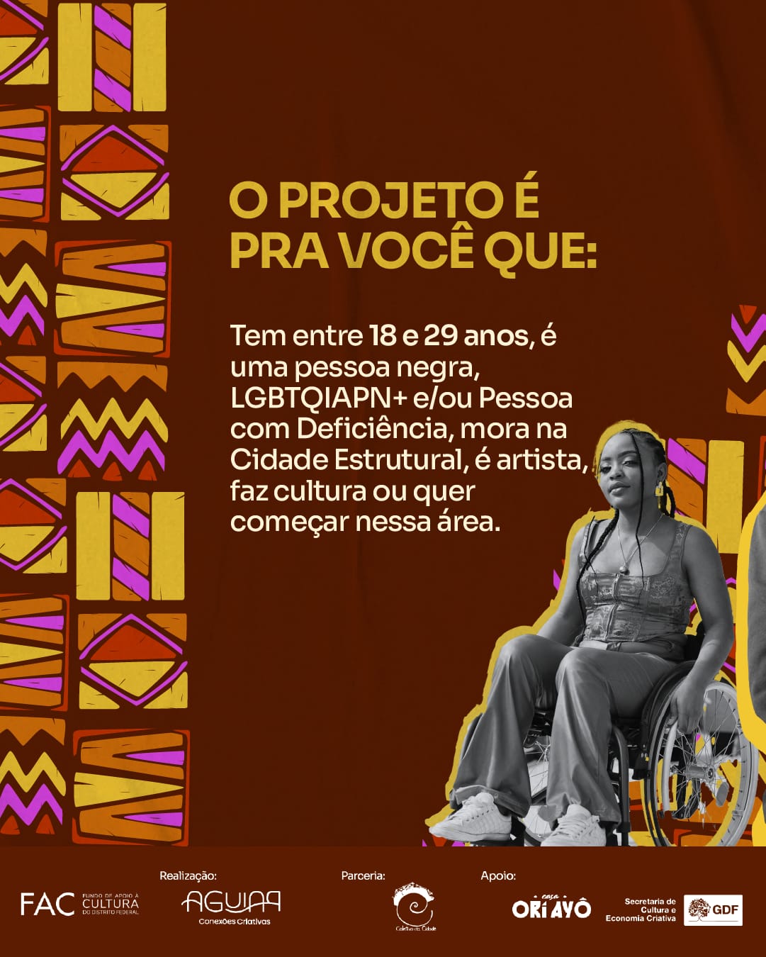 Com foco na juventude negra periférica, o projeto “Pretagonistas” chega à Estrutural (DF) oferecendo formação gratuita para 30 jovens de 18 a 29 anos, com ênfase em mulheres, pessoas LGBTQIAPN+ e PcDs. A proposta é capacitá-los para atuar na produção cultural, por meio de oficinas ministradas por profissionais negros e negras das áreas da cultura, comunicação, artes e ativismo social. Entre as oficinas oferecidas, estão: “Erguer a Voz”, com Nádia Nádila; “Afroturismo”, com Aline Karina; “Autoestima Pretagonista”, com Ana Béa; “Elaboração de Projetos”, com Tássia Aguiar, além de outras oficinas que dialogam com identidade, criação e planejamento cultural.
