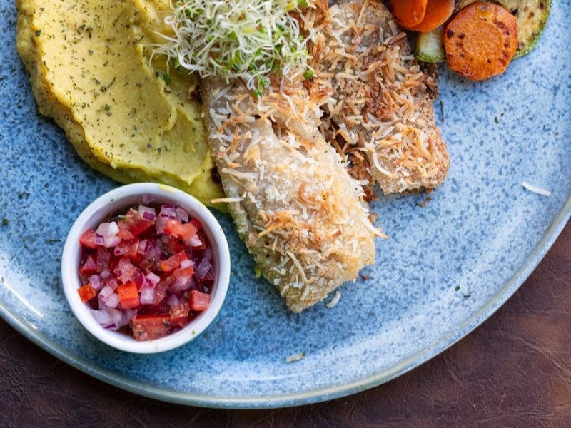 Os pratos principais variam entre o Risoto de picadinho de filé com arroz cateto integral, filé mignon, cogumelo shitake, e farofinha de bacon, acompanhado de banana-da-terra grelhada e couve fresca; e o Peixe Tropical, um filé de tilápia em crosta de coco, servido com purê de banana-da-terra e vegetais salteados (ambos sem lácteos, sem glúten). Há também o Bowl Vegan, uma combinação de quinoa, grão de bico, abóbora, abacate, e tomate cereja, com molho de tahine (vegano/vegetariano, sem lácteos, sem glúten).