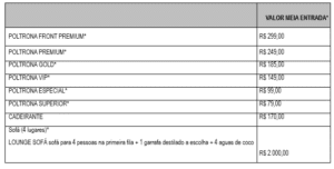 *Meia-entrada: estudantes, idosos acima de 60 anos, Pcd, professores da rede pública e funcionários públicos