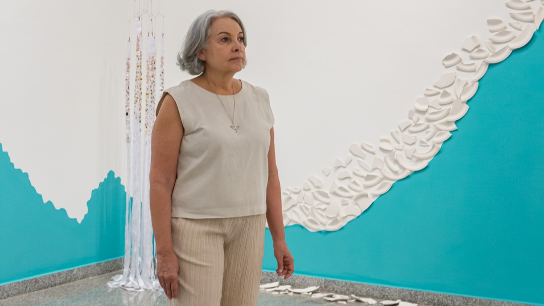 Na exposição, referências genealógicas ficam evidentes em obras como “Mares Vencidos, Destino Apaixonado”, “Casamento Grego”, “Rio das Almas”, trabalhadas em cerâmica, no “Móbile: O Passado O Vento Não Leva”, que carrega em fitas de cetim nomes de parentes e 200 medalhas católicas. Já as pinturas em acrílica, da série “Destino”, mostram travessias marítimas de homens que deixaram seus locais de nascença para se estabelecerem em outros lugares ao lado das famílias que formariam. Entre as instalações, uma das mais impactantes está na vitrine e traz um vestido da mãe da artista: “……………………….”