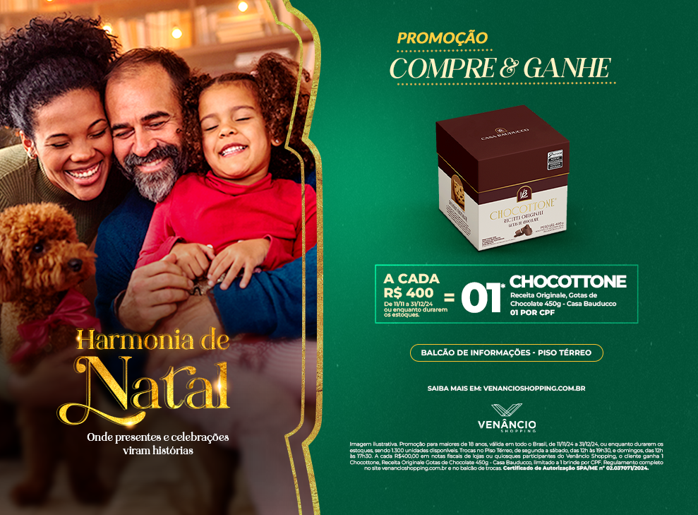 a cada R$ 400 em compras, clientes podem trocar seus cupons fiscais pelo Chocottone Receita Originale, Gotas de Chocolate, 450g da Casa Bauducco. A troca acontece no Balcão de Informações Piso Térreo. O brinde é limitado a uma unidade por CPF. O regulamento pode ser consultado em www.venancioshopping.com.br.