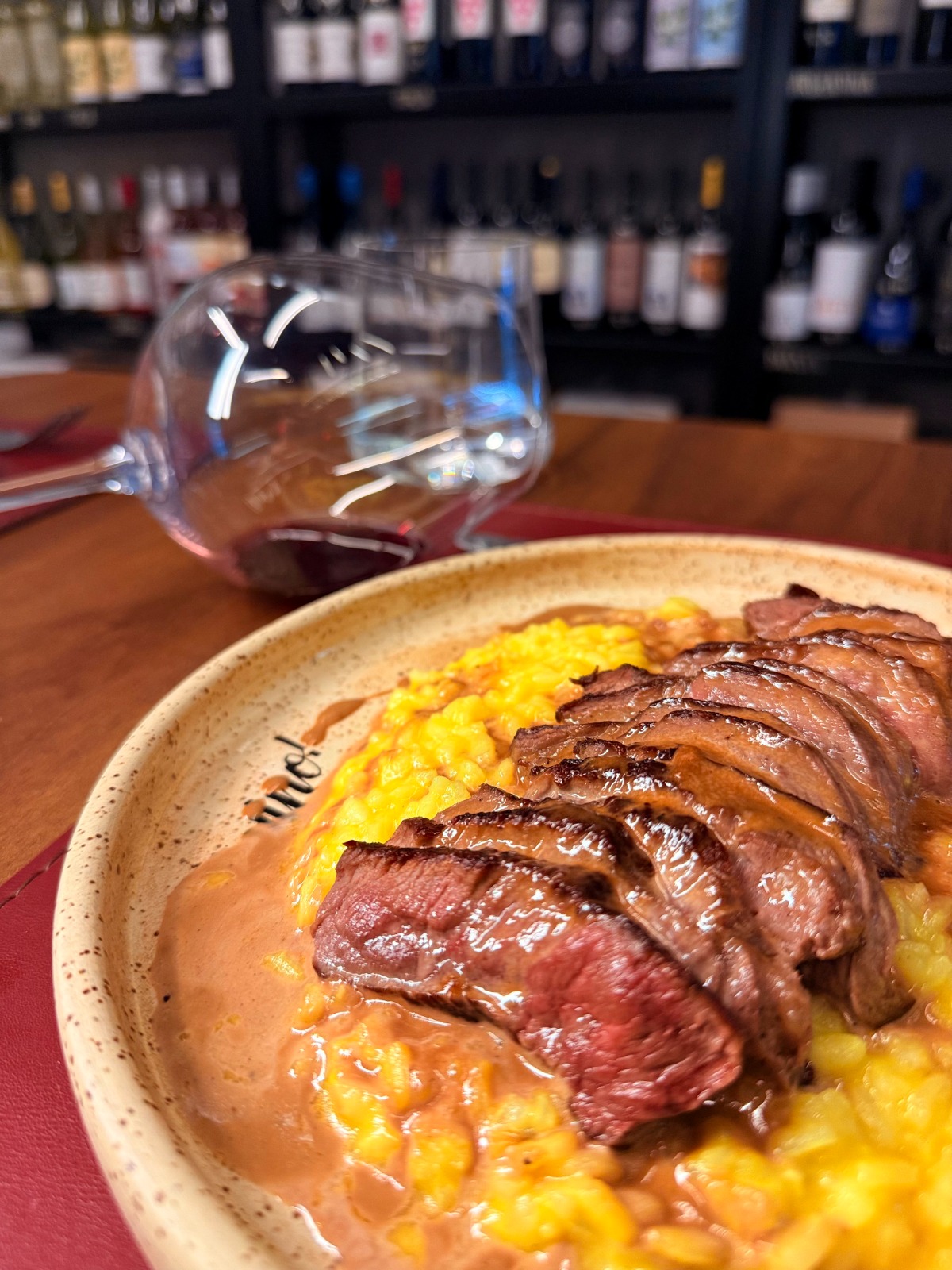 Merlot nacional: com perfil frutado e maciez característica, o Merlot se adapta a diferentes pratos, destacando a cremosidade do risoto e complementando a suculência do baby beef. É uma opção versátil e agradável para quem deseja uma harmonização equilibrada e fácil de apreciar.
